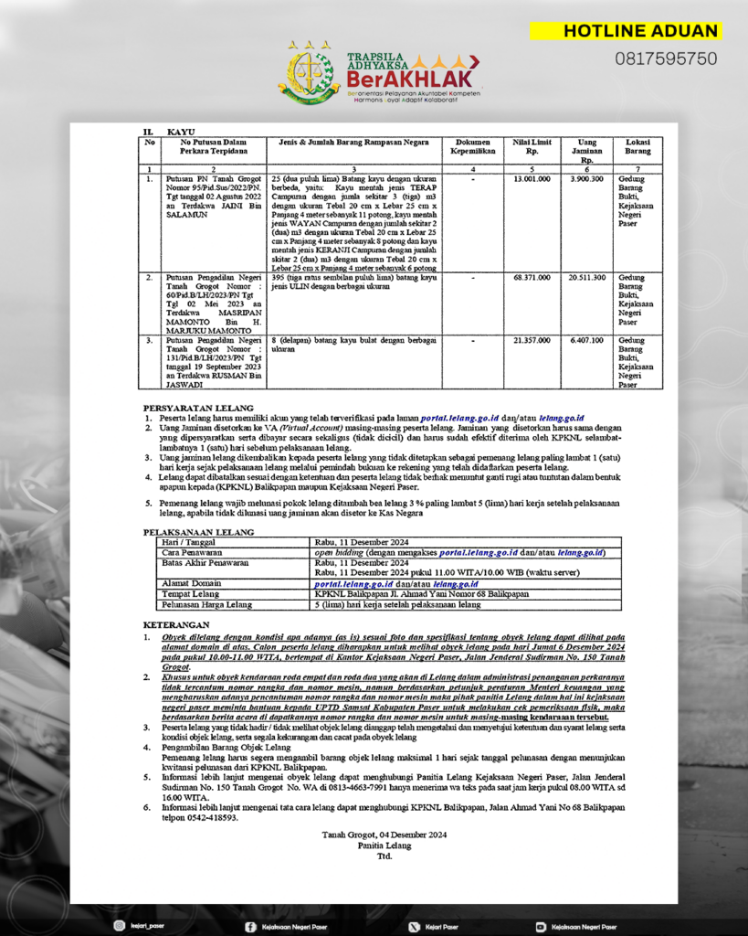 Informasi lebih lanjut mengenai obyek lelang dapat menghubungi Panitia Lelang Kejaksaan Negeri Paser, Jalan Jenderal Sudirman No. 150 Tanah Grogot No. WA di 0813-4663-7991 hanya menerima wa teks pada saat jam kerja pukul 08.00 WITA sd 16.00 WITA